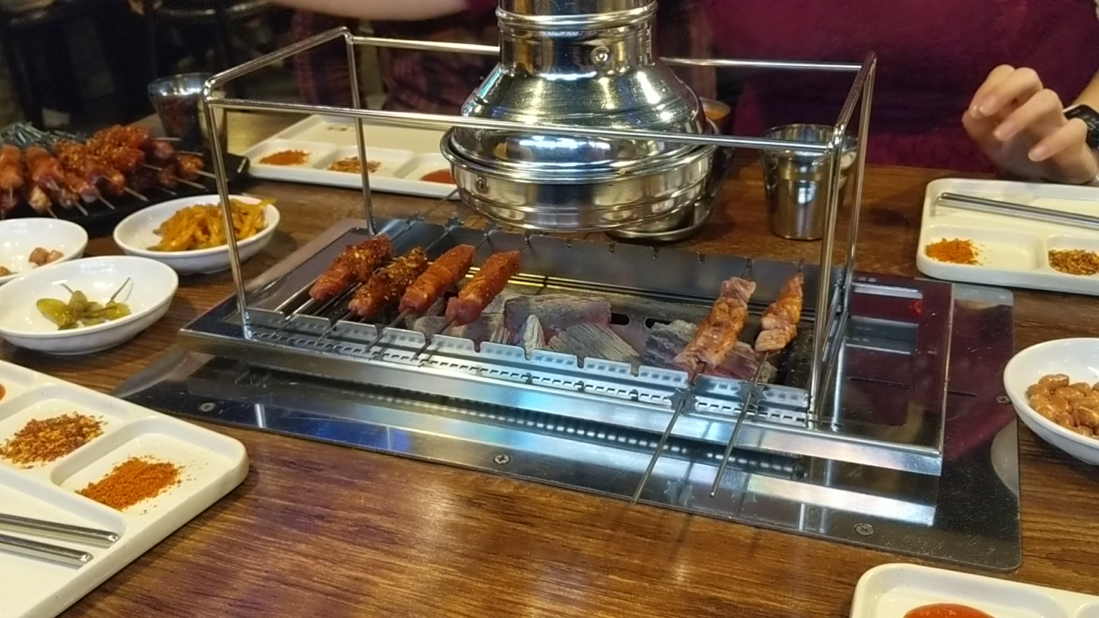 Put the lamb skewers directly over coals, the little spindle track automatically rotisseries them